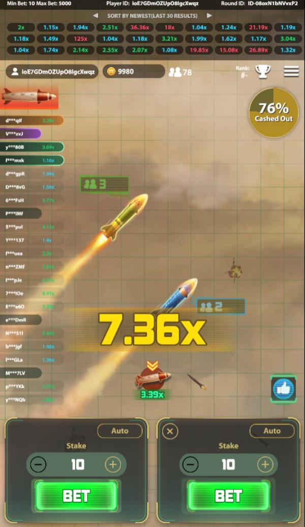 Sau đó tên lửa sẽ di chuyển, đương nhiên đi được quãng đường càng xa thì tỷ lệ ăn tiền sẽ tăng dần. Kèm theo với đó là có nhiều tên lửa nhỏ khác bắn vào 3 tên lửa để phá hủy chúng. Lúc này người chơi cần lựa chọn thời gian rút tiền trước khi tên lửa mình cá cược bị phá hủy để giành chiến thắng. Nếu như trước khi rút tiền mà tên lửa bị phá hủy thì sẽ mất toàn bộ tiền cược của mình.